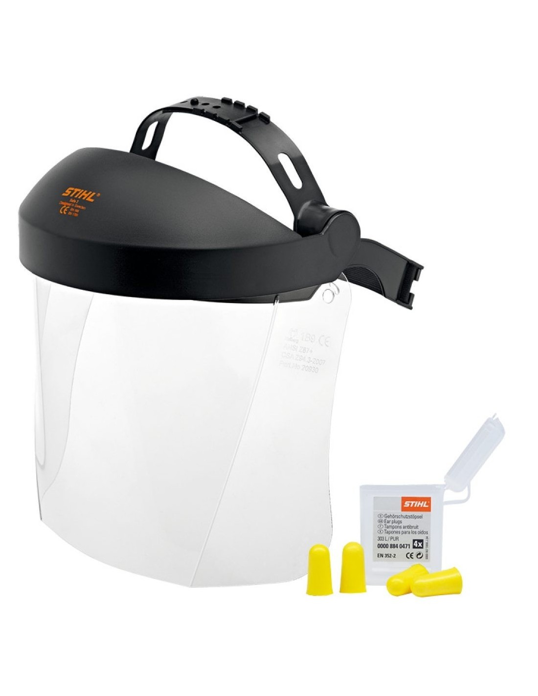 Visières Visière intégrale transparente STIHL STIHL 0000-884-0510 Ecran transparent enveloppant (longueur 200 mm). Coiffe réglable, système d'articulation. Réduction sonore SNR 33 (bouchons d'oreilles). Filtre UV 100%. Normes: EN 352-2 EN 166 Voir